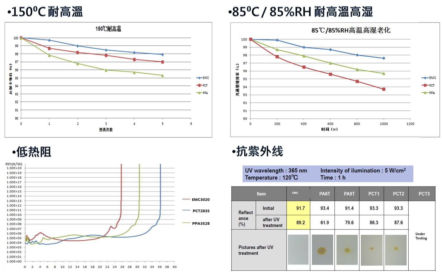 EMC材料在照明行業(yè)的應(yīng)用是伴隨著EMC3030封裝產(chǎn)品走入人們視線的,EMC材料本身具備了較多優(yōu)勢(shì),熱穩(wěn)定性更佳,更低熱阻,同時(shí)抵抗紫外線造成的黃化,在較苛刻的條件下仍能保持很好的性能。EMC封裝市場(chǎng)在帶頭大哥日亞的帶領(lǐng)下,眾多國(guó)際大廠跟進(jìn),三星,SSC, 歐司朗等齊頭并進(jìn),天電也早早地在2011年就完成了相關(guān)產(chǎn)品的布局及量產(chǎn),并成功地為兩家世界500強(qiáng)企業(yè)供貨。