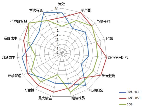 EMC高功率封裝LED產(chǎn)品結(jié)合產(chǎn)品穩(wěn)定性,高性價(jià)比及高性能,勢(shì)必將極大地改變目前的市場(chǎng)格局,COB產(chǎn)品是否仍是商業(yè)照明的最佳選擇,陶瓷封裝LED在戶外的領(lǐng)導(dǎo)地位是否還能保持,PPA、PCT材料封裝LED紅海競(jìng)爭(zhēng)的行業(yè)格局是否會(huì)被打破或重組,這些問題預(yù)計(jì)都將在接下來的兩年內(nèi)揭曉。