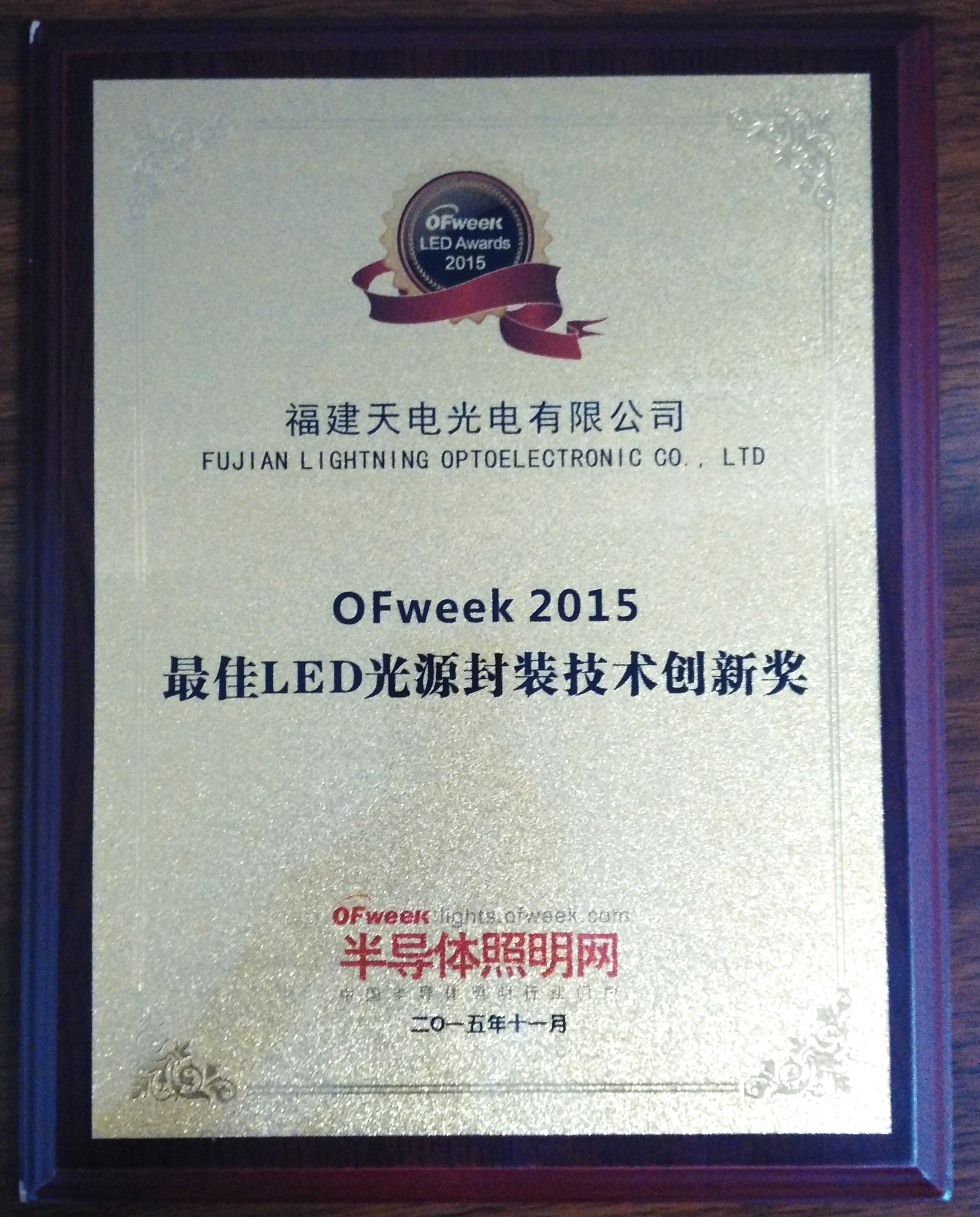 天電光電榮獲OFweek LED Awards 2015“最佳LED光源封裝技術(shù)創(chuàng)新獎(jiǎng)”