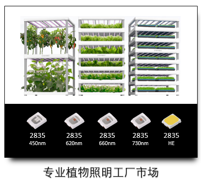 首先目標(biāo)以專業(yè)的植物工廠所設(shè)計(jì)的高光效2835的白光,藍(lán)光,紅光,遠(yuǎn)紅光,深紅光的中小功率產(chǎn)品,